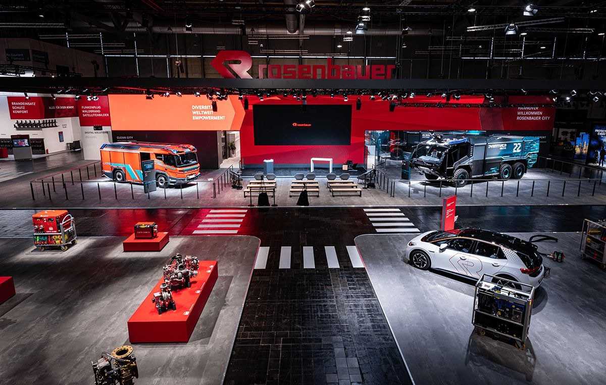 Auf mehr als 4.100 Quadratmetern, verteilt auf mehrere Flächen in der Halle und im Freigelände, präsentierte Rosenbauer auf der Interschutz in Hannover alle Bereiche seines Produkt- und Dienstleistungsportfolios: technische Ausstattung und Löschsysteme, digitale Lösungen, vorbeugender Brandschutz, persönliche Schutzausrüstungen und einen Fanshop. Besonderes Highlight der Präsentation waren die international gefeierte Enthüllung des spektakulären „Panther Electric“, einem elektrischen Flughafenlöschfahrzeug.